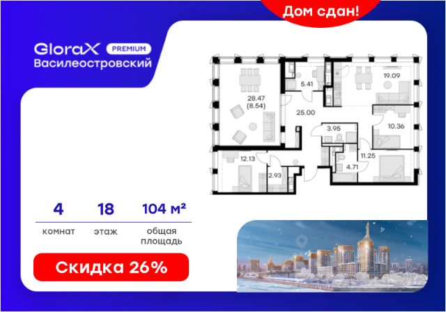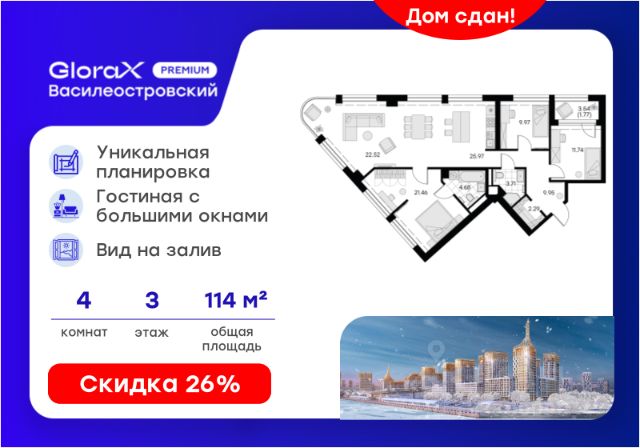 Продается 4-комн. квартира на 19-м этаже в сданном проекте премиум-класса GloraX Premium Василеостровский. Общая площадь лота составляет 100,18 кв. м, из которых 49,46 кв. м отведено под жилую и 20,81 кв. м под кухонную зону. Номер квартиры - 723 Преимущества квартиры: • Пентхаус для большой семьи — просторное, светлое и продуманное до мелочей пространство, где каждый член семьи найдёт свой уголок уюта, а вместе — место для тёплых встреч и совместного времени. • Большая кухня-гостиная — сердце дома, объединяющее функциональность и эстетику. Здесь с лёгкостью разместится вся семья за общим ужином или дружеской беседой, а панорамное остекление наполнит интерьер светом и воздухом. • Гардеробная — стильное и практичное решение для хранения, превращающее повседневные сборы в удовольствие и дарящее порядок в каждом дне. • Три санузла — обеспечивает комфорт, приватность и удобство для всех, избавляя от утренней спешки и создавая ощущение личного пространства для каждого. • Вид на залив — живописная панорама воды, мягкий свет заката и свежий бриз за окном превращают каждый день в маленький отдых у моря. • Этот пентхаус — идеальный дом для большой семьи, где роскошь встречается с теплом, а простор — с безупречным комфортом и видами, вдохновляющими на жизнь в полной мере. GloraX Premium Василеостровский это роскошный видовой комплекс премиум-класса на первой береговой линии Финского залива. Проект уникален по своему опциональному наполнению: вся необходимая для комфортной городской жизни инфраструктура будет в составе самого комплекса. Здесь откроется фитнес-клуб класса премиум, кинотеатр только для резидентов, летом будет работать общая видовая терраса на крыше, откуда откроются потрясающие виды на воду. В GloraX Premium Василеостровский расположится гастрономический кластер - ресторанная улица с видом на Финский залив. В пяти минутах пешком от проекта GloraX строит образовательный кластер. В состав кластера войдет общеобразовательная школа с развивающими пространствами, футбольным полем, большим спортивным стадионом и 2 -мя плавательными бассейнами. Во втором корпусе проекта откроется детский сад с собственной территорией для прогулок. Транспортную доступность обеспечивает близость к ЗСД. Дорога до Дворцовой площади займет 25 минут на автомобиле. Ближайшая остановка общественного транспорта находится в 1 минуте пешком от комплекса. Все квартиры передаются с отделкой White Box. Цена указана при 100% оплате или стандартной ипотеке. Узнайте подробности в Отделе про Купить 4-комнатную квартиру в готовой новостройке в районе Василеостровский в Санкт-Петербурге.