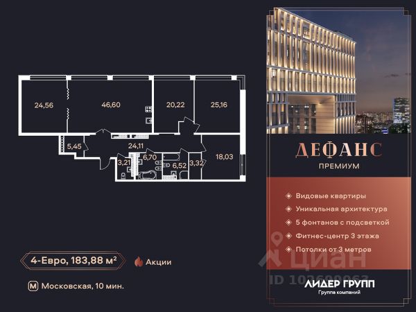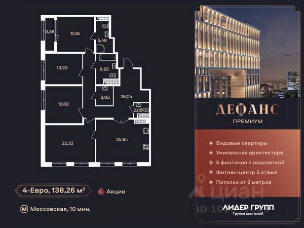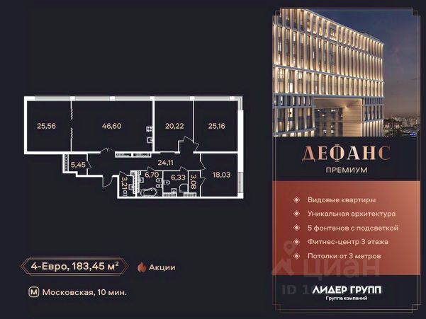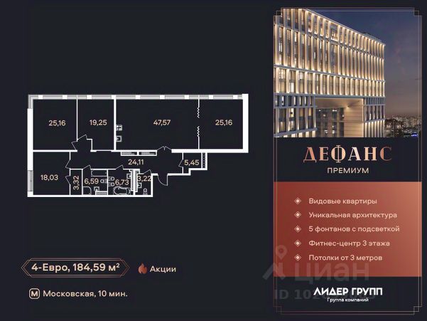 ЖК "Дефанс Премиум". Строительство завершено. Дом получил заключение о соответствии и готовится к вводу! Это проект авторской архитектуры с уникальными форматами квартир в 10 минутах ходьбы от станции метро "Московская". Дом выполнен в виде двух 23-х этажных арок, основания которых объединены единым внутренним пространством с большой парадной лестницей, променадом и большим фонтанным комплексом с подсветкой. В составе проекта построен большой фитнес-центр с бассейнами и зоной СПА. Часть квартир отделена от остальных жилых этажей специальным техническим этажом — это снимает все ограничения по перепланировке. Для части квартир предусмотрены индивидуальные входные группы и дополнительные лифты премиального немецкого бренда Tyssen Krupp (TKE). Фасады, облицованные испанской керамикой и алюминиевые панорамные окна с энергоэффективными стеклами AGС Energy подчеркивают высокий статус дома. На квартиры ЗПИФ и переуступки семейная ипотека не распространяется!