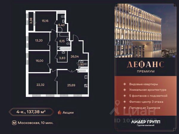 Общая площадь квартиры — 101,6 м², жилая - 61,2 м.