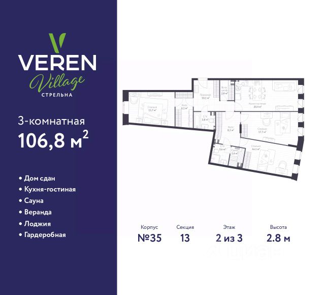 Просторная 3-комн. квартира в ЖК "VEREN VILLAGE Стрельна" на 3 этаже. Квартира без отделки, полностью готова к ремонту. Общая площадь: 99.4 кв.м., жилая: 39.25 кв.м., площадь просторной куxни-гостиной: 32.17 кв.м. Угловая квартира, очень светлая, естественная вентиляция при открытии окон. В квартире два балкона, два совмещенных санузла. Высота потолков 2.8 м.