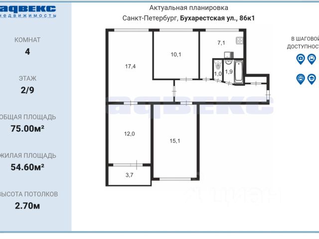ID: 1912594 превосходное местоположение между двумя станциями метро, рядом парки и скверы для прогулок, церковь полная стоимость в ДКП, один взрослый собственник, рассматриваем любые виды оплаты общая пл.: 74.00 м2, жилая пл.:54.60 м2, пл.комнат:15.1+12+17.4+10.1 м2, кухня:7.10 м2, прихожая: 4.00 м2, коридор: 9.00 м2, панельный (г.п. 1967; ), этаж 2/9; потолок 2.70 м.; - дом расположен в безопасном месте, от остановок общественного транспорта всего 2-4 минуты, до метро: Международная 840 м, до метро Проспект Славы 840 м, - застекленная лоджия - полностью выровнены полы, - заменены окна, двери, радиаторы отопления, - сделаны натяжные потолки, - эл. бойлер установлен в уборной, удобно пользоваться во время профилактического отключения горячей воды, - на кухне вытяжка пол: ламинат, напольная кафельная плитка в прихожей, кухне, санузле, - отличная светлая квартира, - в прихожей сделан кафельный пол, практично для смены уличной обуви, также подключена стиральная машина, не занимает много места, работа ее не слышна, частично остается техника и мебель детская и взрослая поликлиники в 10 минутах ходьбы в соседнем здании сетевой продуктовый магазин и множество мелких торговых лавочек, любые бытовые услуги; окна на две стороны, три во двор, два на Бухарестскую, от проезжей части дом отделен зеленым сквериком, дорогой-дублером и зеленой аллеей с велосипедными дорожками, - во дворе: корт для футбола/баскетбола; спортивные тренажеры для детей и взрослых, для отдыха детская площадка с качелями, батутами, горками, транспортная доступность во многие районы города и в область великолепна, до метро Проспект Славы 9 мин. пешком; до метро Международная 13 мин. пешком; до метро Проспект Славы Бухарестская 5 мин. транспортом, автобус маршрута 54 от дома довезет до Смольного; трамваи от метро Купчино до метро Электросила, маршрут 43; до метро Парк Победы маршрут 45; до Кузнечного переулка (центр города) маршрут 25 и 49; по пр Славы автобусы и троллейбусы едут в Невский, Красногвардейский, Кировский и Московский районы