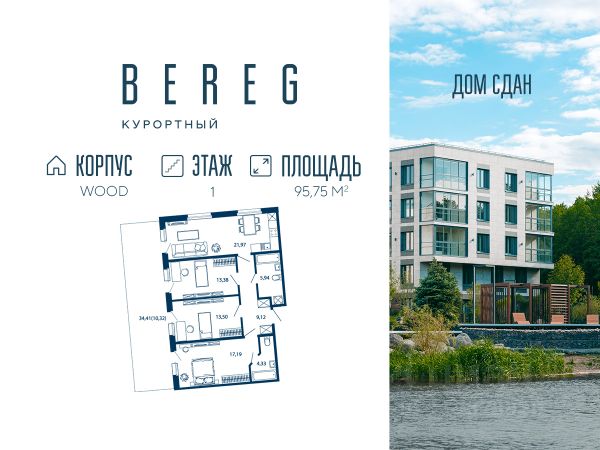 Апартамент 685 площадью 95,75 кв.м. в корпусе Wood с видом на улицу Дом сдан!!! О проекте: "Bereg. Курортный" первый проект петербургского девелопера ELEMENT (ранее Element Development) в Санкт-Петербурге, который был сдан в мае 2024 года. Малоэтажный проект расположен в тихой части Сестрорецка, в окружении парков "Гагарка" и "Дубки", на берегу живописного канала. В составе комплекса три корпуса: AIR, AQUA и WOOD ("Воздух", "Вода" и "Дерево"), которые включают 715 апартаментов, в том числе юниты с террасами-патио на первом этаже. Комплекс обеспечен всей инфраструктурой для комфортной жизни от детского клуба до собственной спа-зоны с бассейном, сухой сауной и тренажерным залом. "Курортную" атмосферу поддерживают концепция "двор без машин", перголы для отдыха, детские площадки в стиле "эко", променад на набережной с "островками" для медитации, а также зеленое благоустройство от Derevo Park на 28 000 растений. "Bereg. Курортный" ("Берег Курортный") расположен в тихой части Сестрорецка, в окружении заповедного лесопарка "Гагарка". Напротив, проекта любимый петербуржцами парк "Дубки". Всего в 300 метрах от комплекса находится небольшой яхт-клуб, где можно оставить свой катер или небольшую яхту. Преимущества "Bereg. Курортный" ("Берег Курортный"): 3 корпуса; 5 этажей; Концепция "двор без машин"; Закрытая территория с системой контроля доступа; Своя инфраструктура: лобби, бассейн, коворкинг, детский клуб; Собственная благоустроенная набережная; 300 метров до Финского залива; Рядом расположен в лесопарке; Эко-тропа с выходом в лесопарк "Гагарка"; ELEMENT создаёт инновационные жилые и коммерческие объекты в Санкт-Петербурге и Москве, которые устанавливают новые стандарты эффективной жизни в мегаполисах.