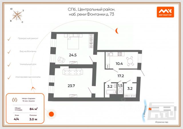 Уникальное предложение в историческом центре Петербурга ! Современный клубный дом Невский модерн всего на 5 квартир ! Проект был номинирован на премию Живой город. Кирпично-монолитный дом с отделкой из камня 2007 года постройки. Видовая крыша-патио. Дом под охраной и круглосуточным видеонаблюдением. Есть теплый крытый паркинг и две кладовые. Благоустроенная парадная с гостевым санузлом. Тишина и покой создают ощущение загородной жизни посреди городской суеты. О квартире: Квартира занимает полный этаж, лифт в квартиру. По всей квартире панорамное остекление. Окна спален выходят в тихий двор. - 3 изолированные комнаты (мастер-спальня с гардеробной, детская со своей гардеробной и кабинет) - просторная кухня-гостиная 60 м² - 2 санузла и отдельная прачечная ! - балкон с 2 выходами Интерьер оформлен в светлых тонах и оснащён современной мебелью: - кухня итальянского премиум бренда Arrital с островом - обеденный стол из тика - встроенная мебель ручной работы с множеством мест для хранения - мягкая мебель итальянских производителей Вся техника и оборудование исключительно европейских производителей с высокой степенью надёжности и экологичности: - встроенная техника Neff - акустическая система Linn (Англия) - приточно-вытяжная система кондиционирования Fujitsu в каждой комнате - бойлер OSO Hotwate (Норвегия) на 300л - оборудование в постирочной Siemens - входные двери и электронный замок с чипом повышенной степени защиты Gardesa - европейская сантехника - санузлы отделаны натуральным мрамором - напольное покрытие - паркет из сандалового дерева и мрамор. О локации: Золотая середина между деловым и историческим центрами Санкт-Петербурга. Вы одинаково быстро доберетесь как до главных памятников архитектуры, так и до бизнес-центров или правительственного квартала (Ратуша, Смольный итд). В пешей доступности лучшие магазины и рестораны города, Овсянниковский сад (3 минуты). О документах: Прямая продажа, 1 владелец, в собственности больше 5 лет. Квартира для настоящих ценителей комфорта, для тех, кто по-настоящему ценит безопастность и покой. Тишина в самом сердце города ! Остались вопросы ? Звоните ! Продается 4-комнатная квартира с евроремонтом на улице 4-я Советская в Санкт-Петербурге.