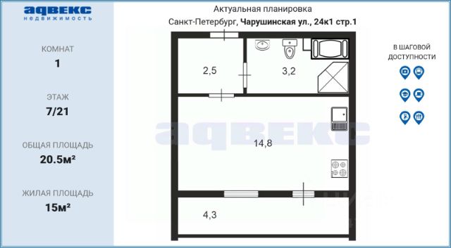 В шаговой доступности расположены: продуктовые магазины, универсамы, Пятерочка, Магнит, Перекресток, Мята, Дикси, гипермаркет О'КЕЙ, Лента, кофейни, пекарни, салоны красоты, фитнес- центры, аптеки , поликлиники, ПВЗ, почта.