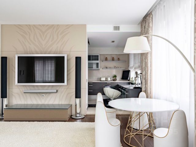 Просторная кухня-гостиная, площадью 60,6 м. кв. с камином выходит окнами на фонтан и смотрит в сторону, где река Карповка впадает в р. Малая Невка и на перспективу Крестовского и Каменного островов.