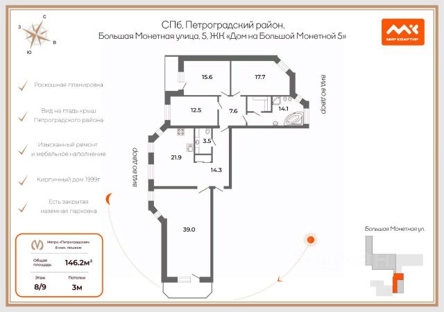 Арт. 124816551 На Петроградской стороне, в спокойной части улицы Бармалеева, предлагается квартира с характером. Пространство площадью 180 м² расположено на шестом, последнем этаже камерного дома с тёплой видовой террасой, действующим камином и подземным паркингом. Здесь продуманная планировка сочетается с тактильной эстетикой, а интерьер поддерживает идею уюта без формального лоска. Дом построен в 2002 году по индивидуальному проекту в стиле современной неоклассики. Он вписан в исторический контекст района: спокойная этажность, симметрия фасада, лепной декор. В подъезде — один лифт, чистая парадная, прямая связь с подземным паркингом. Интерьер выполнен в классическом стиле без излишеств, но с вниманием к деталям. Использованы натуральные материалы: полы из канадского дуба и мрамора, двери, плинтусы и мебельные вставки — из массива дуба, бука и вишни. Потолки украшает гипсовая лепнина ручной работы. Освещение подобрано сдержанно и изысканно: итальянские люстры и настенные бра. Кухня изготовлена на итальянской фабрике Martini. Встроенная техника — Kppersbusch, холодильники — Liebherr. Гарнитур выполнен в нейтральной тёплой гамме, с акцентом на соразмерность и мягкость линий. Каменная столешница, встроенные системы хранения и продуманные фасады поддерживают визуальное спокойствие и функциональность. Планировка включает открытую кухню-гостиную с камином и выходом на застеклённую, тёплую террасу. Также предусмотрены две спальни, кабинет (который может быть переосмыслен как третья спальня), хозяйственный блок и две ванные комнаты. Каждая зона логично выделена и выполняет свою функцию. Дневная часть объединена и наполнена светом, приватные комнаты изолированы. Терраса оформлена термоясенем и визуально продолжает гостиную. Это редкий для центра города формат: частное открытое пространство для отдыха, обеденной группы или зимнего сада. Панорамное остекление обеспечивает хорошую освещённость и ощущение воздуха. Мастер-спальня выполнена в светлой гамме с плотным текстилем и встроенными системами хранения. Вторая спальня и кабинет выдержаны в едином стиле с акцентом на дерево и текстуру. Кабинет легко трансформируется в жилую комнату — инженерные решения уже предусмотрены. Главная ванная комната отделана мрамором и декоративным ониксом с подсветкой, установлена гидромассажная ванна Jacuzzi. Второй санузел и постирочная зона оформлены в том же ключе. Все инженерные элементы скрыты и не нарушают целостность интерьера. Квартира воспринимается как единое пространство — спокойное, продуманное, с настроением. Это не стилизованная классика, а архитектурно выстроенный интерьер, в котором удобно жить. Планировка, отделка и освещение уже сбалансированы — остаётся только внести личные штрихи. Такой формат встречается редко. Камерный дом с архитектурным обликом, терраса, камин, качественные материалы и полная готовность к жизни без компромиссов. Купить 4-комнатную квартиру в округе Кронверкское в Санкт-Петербурге.