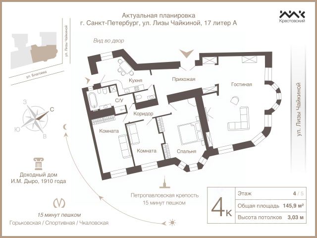 Арт. 104148258 Здравствуйте, наш Уважаемый покупатель! Вашему вниманию предлагаем великолепную 4-х комнатную квартиру, общей площадью 216 м, в престижном Петроградском районе в пешей доступности от метро! Квартира расположена в красивом доходном доме Н.А. Бородулина, построенным в стиле эклектика архитектором А.К. Гаммерштедт, облик которого хранит дух истории. Квартира находится на 5 этаже и имеет два отдельных входа (парадный с Большого пр П.С и со двора), что позволяет Вам при желании разделить ее на две полноценные квартиры! В квартире 4 просторных комнаты и функциональная кухня-гостиная с выделенной постирочной зоной , что позволит Вам воплотить любые планировочные решения. Изюминкой данной квартиры является светлая гостиная площадью 47,4 кв. м. с выходом на 2 балкона, а также великолепный эркер , откуда открывается прекрасный вид на панораму Петроградской стороны. Высота потолков в Гостиной 3,8 м, что добавляет ей света и пространства! Интерьер выполнен в светлых тонах, что создает дополнительный уют и комфорт. Во всей квартире сделана шумоизоляция, что позволяет Вам наслаждаться тишиной. Установлена надежная система кондиционирования (Mitsubishi) , канальная система приточно-вытяжной вентиляции с рекуператором, подогрев полов, центральный пылесос, проточный котел (Bosh), а в комнатах выложен качественный паркет! Эта квартира с настоящим Петербургским шармом не оставит Вас равнодушными! Парадный вход осуществляется с Большого пр П.С, парадная чистая и поддерживается в хорошем состоянии, во дворе есть место для парковки. Квартира находится в историческом Петроградском районе Санкт-Петербурга, она прекрасно подойдет для проживания одной семьи , двух семей, так и для бизнеса, так как ее можно разделить на две полноценный квартиры! Звоните, осуществите свою мечту, Ваша квартира ждет только Вас! Продается 4-комнатная квартира в округе Введенский в Санкт-Петербурге.