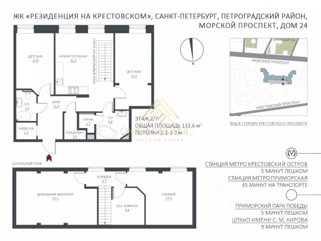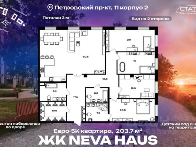 NEVA HAUS — современный жилой комплекс, расположенный на берегу реки Малой Невки. Большая часть комплекса была введена в эксплуатацию в 2022 году. Продается просторная двухсторонняя квартира площадью 156 кв. м с высотой потолков 3 м. Квартира расположена в привилегированном корпусе 3 на первом этаже. Всего в здании 9 этажей. Видовая перспектива со стороны кухни-гостиной открывается на восток и выходит на прилегающие зелёные, ухоженные придомовые территории с высокими деревьями, детскими площадками, а также на соседствующее с домом историческое малоэтажное здание цвета пыльной розы. Противоположная часть квартиры ориентирована на закрытый ухоженный внутренний двор с современными зелёными посадками, вечерней подсветкой и аккуратными тропинками. Квартира очень тихая, так как её окна не выходят на оживленные дороги или магистрали. Здание третьего корпуса отделено от Петровского проспекта огромной территорией, на которой расположено современное здание школы с впечатляющими спортивными площадками и бассейнами. Планировка квартиры включает четыре отдельные спальни с возможностью выделения шести комнат. Прилегающая к кухне комната может быть использована для расширения кухонного пространства и создания идеальной кухни-гостиной с функциональными зонами. Квартира очень светлая благодаря восьми окнам, пропускающим большое количество естественного света. Планировка предусматривает три отдельные ванные комнаты, одна из которых с окном, что подчеркивает высокий статус объекта. Входная группа выполнена из дорогих натуральных материалов и оснащена колясочной. Лифт спускается в подземный паркинг. NEVA HAUS — единственный жилой комплекс, который напрямую соседствует с историческим парком ветеранов сцены им. Савиной. Это соседство с проектами Петровского острова, где на первых этажах расположены коммерческие объекты, создаёт комфортную инфраструктуру для жителей комплекса. Прямо рядом — магазины, аптеки и кафе, но эти сервисы находятся не в вашем доме, а в шаговой доступности от него. Петровский остров стремительно приобретает статус современного элитного микрорайона, где активно развивается социальная инфраструктура: новые детские сады, салоны красоты, спортивные студии. Этот район особенно подойдёт тем, кто ценит водные виды активностей: Санкт-Петербургский речной яхт-клуб и Luxury Marine с услугами аренды яхт и катеров расположены по соседству с NEVA HAUS. Кроме того, в пределах пешей доступности находятся футбольная школа ФК "Балтика" и школа художественной гимнастики "Жемчужина". Важным преимуществом является удобная транспортная доступность — рядом мосты, соединяющие Васильевский, Петроградский и Крестовский острова. На Петровском проспекте развита система общественного транспорта, а ближайшие станции метро — "Крестовский остров" и "Спортивная".