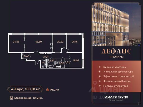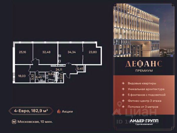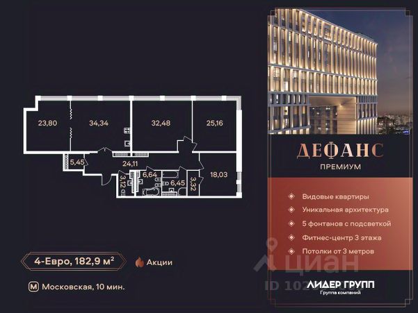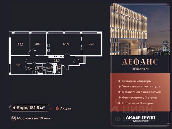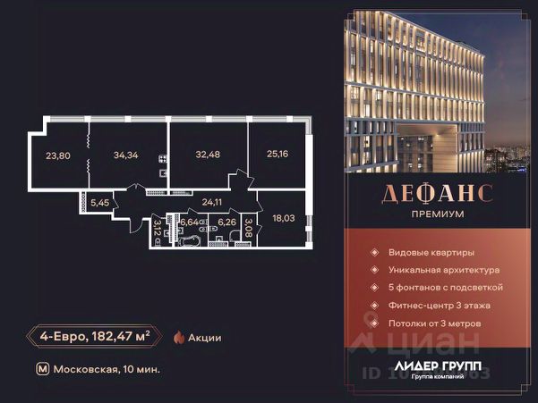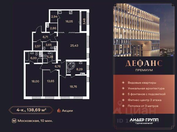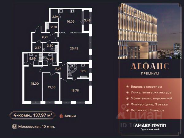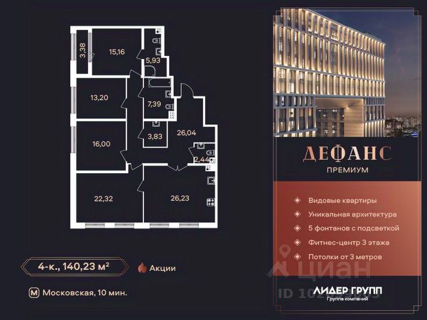 ЖК "Дефанс Премиум". Строительство завершено. Дом получил заключение о соответствии и готовится к вводу! Это проект авторской архитектуры с уникальными форматами квартир в 10 минутах ходьбы от станции метро "Московская". Дом выполнен в виде двух 23-х этажных арок, основания которых объединены единым внутренним пространством с большой парадной лестницей, променадом и большим фонтанным комплексом с подсветкой. В составе проекта построен большой фитнес-центр с бассейнами и зоной СПА. Часть квартир отделена от остальных жилых этажей специальным техническим этажом — это снимает все ограничения по перепланировке. Для части квартир предусмотрены индивидуальные входные группы и дополнительные лифты премиального немецкого бренда Tyssen Krupp (TKE). Фасады, облицованные испанской керамикой и алюминиевые панорамные окна с энергоэффективными стеклами AGС Energy подчеркивают высокий статус дома. На квартиры ЗПИФ и переуступки семейная ипотека не распространяется!