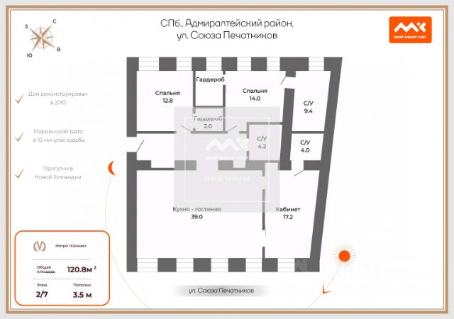 Арт. 63070916 Квартира с видом на тихую набережную канала Грибоедова Продаётся квартира площадью 249 кв. метров — одна сторона выходит в ухоженный двор, вторая сторона смотрит на канал Грибоедова: - Изящный фасад дома в лучших традициях архитектуры города отреставрирован, внутри сделан капитальный ремонт, в квартире всё готово к чистовой отделке. - В дом два входа. Парадный с кариатидами и украшенной позолоченными ветвями лестницей ведёт с набережной канала Грибоедова. - Большое пространство для хозяев и гостей: 3 спальни, гостиная, кухня-столовая и два санузла. - В большой комнате с видом на канал много естественного света, благодаря эркеру, а также есть место камина. В трёх минутах ходьбы метро "Сенная площадь". Вокруг множество ресторанов, магазинов, фитнес-клубов, школы и детские сады. Рядом есть вся необходимая инфраструктура в пешей доступности: - магазины, аптеки, фитнес-центры, рестораны, - школы и дет. сады, - а так же музеи, театры и пр. Хорошая транспортная доступность - в 3 мин. ходьбы метро Сенная-Спасская-Садовая; 15 мин. до ЗСД. Один взрослый собственник.