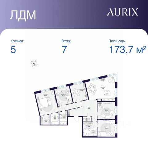 Продается 5-к квартира без отделки в ЖК "ЛДМ". Общая площадь квартиры — 173.7 кв. м, этаж 7 из 8. Тип дома — монолитный. Цена указана при 100% оплате.