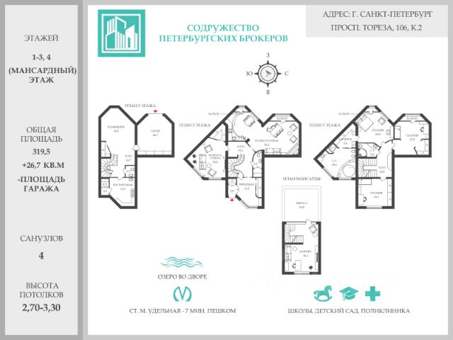 Оазис в 20 мин. от центра города! Уникальное предложение - таунхаус 2004 года постройки, расположенный рядом с парком Сосновка. Из окон открывается вид на озеро Линден и зону отдыха, создавая ощущение, что это шикарная загородная дача в черте города. Дом окружён зеленью и это придаёт особую атмосферу месту вашего будущего проживания. О ДОМЕ: Кирпичный дом с железобетонными перекрытиями построен по индивидуальному проекту. Всего 5 квартир в доме. Территория огорожена, по периметру - видеонаблюдение. При въезде на территорию дома расположено КПП. Находится в управлении ТСЖ "Сосновка", своевременно проводятся все необходимые работы по обслуживанию дома и прилегающей территории. В собственности у членов ТСЖ находится земельный участок (14,6 сот). О КВАРТИРЕ: В квартире выполнен дизайнерский ремонт с использованием материалов европейского качества, использованы уникальные, ручной работы элементы декора. Квартира полностью укомплектована мебелью итальянских фабрик (SMANIA, SELVA, BM STYLE, CAROTI), светильниками из Италии и техникой. В гостиной установлен действующий камин, двери изготовлены на заказ, на полу наборный паркет из ценных пород дерева. Просторная кухня оборудована современной техникой и удобной мебелью, поэтому готовить и принимать гостей здесь — одно удовольствие. Квартира занимает четыре этажа, на нижнем этаже - гараж на два автомобиля. На втором и третьем этажах квартиры есть балконы, на четвёртом этаже - просторная открытая терраса. В планировку квартиры включены: большая кухня-гостиная, прачечная, три спальни, четыре сан. узла, гардеробные, комната отдыха (кинотеатр), кабинет. Вход и вид из окон на две стороны. ИНФРАСТРУКТУРА: Рядом сразу три станций метро: Удельная (1,1 км), Озерки (2,6 км) и площадь Мужества (3 км). В шаговой доступности благоустроенный парк Сосновка и Удельный парк для пеших прогулок, пробежек и прогулок с питомцами. Район отлично развит: рядом школы, гимназия, лицей, школа искусств, детские сады, аквапарк, фитнес, медицинский центр, МФЦ, торговый центр, рестораны и множество продовольственных магазинов. Всё необходимое для комфортной жизни находится в шаговой доступности. Удобное расположение позволяет быстро добираться до любой точки города. В 10 минутах съезд на ЗСД, без труда можно выехать в сторону Финского залива на природу. СДЕЛКА: Квартира и гараж продаются по договору купли-продажи. Возможна покупка в ипотеку, юридическая чистота документов проверена, без обременений , прямая продажа. Записывайтесь на просмотр, и вы увидите, что это именно то, что вы искали. Купить 5-комнатную квартиру элитные на проспекте Тореза в Санкт-Петербурге.