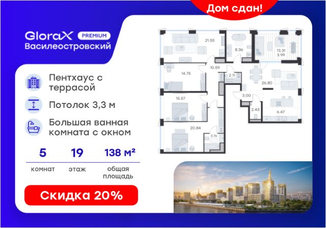 Ваша квартира — это идеально продуманное пространство: - КВАРТИРА НА ТРИ СТОРОНЫ — открываются виды на благоустроенный двор и на город. - ДВЕ ЛОДЖИИ, ОДНА ИЗ НИХ ИЗ КУХНИ размером 10 м² — дополнительное пространство для утреннего кофе или вечерних игр с детьми. - УДОБНАЯ НИША ПОД ШКАФ ПРИ ВХОДЕ — сразу решает вопрос с хранением вещей. - ВСЕГО ОДНА КВАРТИРА НА ЭТАЖЕ — это максимальная приватность и тишина. - ПАНОРАМНЫЕ ОКНА В ПОЛ — дарят квартире максимальное количество света и открывают прекрасные виды. Ваша квартира — это идеально продуманное пространство: - КВАРТИРА НА ТРИ СТОРОНЫ — открывается вид на благоустроенный двор, город и воду. - ДВЕ ЛОДЖИИ, ОДНА ИЗ НИХ ИЗ КУХНИ — удобно выходить с утренним кофе на свежий воздух. - НИША ПОД ШКАФ ПРИ ВХОДЕ — возможность организовать удобный гардероб. - СЕМЕЙНАЯ СЕКЦИЯ — всего 1 квартира на этаже. - ПАНОРАМНЫЕ ОКНА В ПОЛ— максимальное количество света и красивые виды. - ЧЕТЫРЕ САНУЗЛА — один из которых можно оборудовать под прачечную. - БОЛЬШАЯ КУХНЯ-ГОСТИНАЯ — идеальное место для семейных обедов, приемов гостей и создания уютной атмосферы. - ТЕРРАСА НА ТРИ СТОРОНЫ — панорамный обзор и максимальное погружение в окружающие пейзажи. - ТЕРРАСА РАЗМЕРОМ 193,2 М² — это не просто балкон, а целая открытая резиденция для жизни. - ОКНО В ВАННОЙ КОМНАТЕ — редкая особенность, которая обеспечивает естественную вентиляцию и наполняет пространство природным светом. - МАСТЕР-СПАЛЬНЯ С ДВУМЯ ОКНАМИ — наполняйте комнаты светом и начинайте день с вдохновения. - НИША ПОД КОНДИЦИОНЕР — готовое технологическое решение для комфортного микроклимата без ущерба для ремонта. ЖК "Нахимов" — готовый клубный дом бизнес-класса ВСЕГО на 118 квартир. Эталон безупречного стиля и приватной жизни всего в 600 метрах от набережной Финского залива, что гарантирует близость к центру города и удобный выезд на ЗСД. В ЖК "Нахимов" ТОЛЬКО трёх- и пятикомнатные квартиры! Эксклюзивные планировки площадью от 100 до 215 м². 18-этажная элегантная высотка с фасадами в насыщенных шоколадных тонах и золотыми акцентами стала новой архитектурной жемчужиной Васильевского острова. Вас встречают дизайнерская отделка холлов и клубная атмосфера, подчеркивающие статус вашего выбора. Панорамные французские окна с живописными видами на город и двор создают особую атмосферу. А благоприятная экология и развитая инфраструктура района делают жизнь здесь по-настоящему комфортной. Для настоящих ценителей недвижимости предлагаются уникальные квартиры с террасами на 14 этаже — ваша квартира будет единственной в секции, что подчеркивает эксклюзивность и принцип "мало квартир на этаже". Собственный детский сад на первом этаже, школа во дворе, подземный паркинг, современные инженерные системы и безупречный сервис. Ваш шанс поселиться у воды — последние квартиры в продаже! Дом сдан. Успейте купить по выгодной цене!