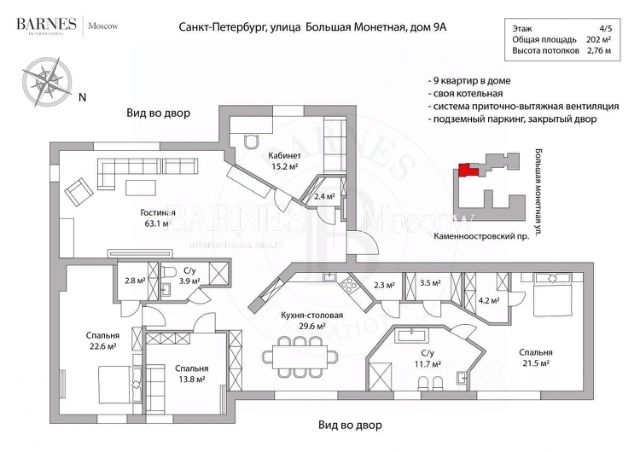 Предлагается к покупке элегантная трехсторонняя квартира с дизайнерским ремонтом премиум-класса расположена в знаковом здании 1913 года постройки, созданном архитекторами Яковлевом и Зазерским. Дом отличается шедевральной архитектурой в стиле неоклассицизма: порфировидный гранит цоколя, кариатиды на фасадах, уютный мощённый двор-курдонёр с аутентичной оградой и фонарями. Квартира предлагает продуманную планировку: светлая гостиная с камином и балконом, изолированная мастер-спальня с видом во двор, две детские комнаты, гостевая комната и просторная гостиная с панорамными окнами в тихий сквер. В отделке использованы элитные материалы: наборный дубовый паркет, мраморные подоконники, массивные двери из сосны, керамогранит. Вся техника и инженерные решения подобраны для комфортной жизни: встроенная техника NEFF, сантехника VilleroyBoch и Jacob Delafon, радиаторы Irsap, приточно-вытяжная вентиляция, кондиционер в кухне-столовой, деревянные стеклопакеты из лиственницы. Локация сочетает престиж и удобство: в шаговой доступности лучшая гимназия 56, детский центр "Журавушка", клиники, бизнес-центры Аптекарской набережной. Идеальный вариант для взыскательных покупателей, ценящих исторический шарм и современный комфорт. Живописные набережные Средней Невки и уютный Лопухинский сад с тенистыми аллеями создают атмосферу уединённого отдыха прямо в центре города. Парадный вход с Каменноостровского проспекта подчёркивает статусность дома, а отреставрированная входная группа с охраной и видеонаблюдением обеспечивает приватность и безопасность. В парадной всего 6 квартир камерность и эксклюзивность проживания. Дополнительные преимущества металлические перекрытия, гарантирующие тишину и покой, а также два парковочных места во дворе. Этот дом для тех, кто ценит гармонию престижной локации, уют зелёных зон и безупречный сервис.