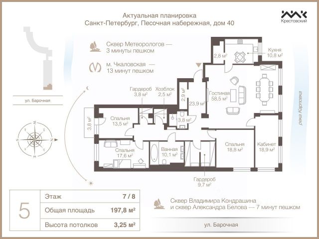 Гостиная, кухня, 3 изолированные спальни, кабинет, 2 с/у, гардеробные, постирочная, балкон