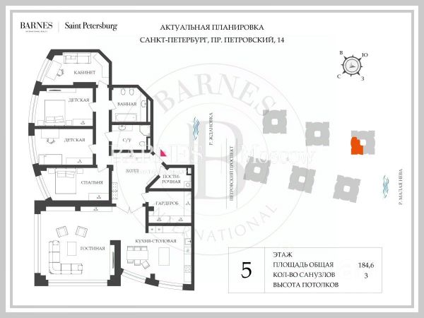 NEVA HAUS — новый уровень жизни в самом сердце Петровского острова. Расположенный на живописном берегу Малой Невки, этот современный жилой комплекс с собственной прогулочной набережной длиной 600 метров — идеальное место для тех, кто ценит комфорт, эстетику и природную тишину. Предлагается уникальная угловая квартира без ремонта, открывающая великолепные виды на воду и зелень Крестовского острова, а также на широкий ухоженный променад между зданиями. Продуманное ландшафтное оформление с яркими акцентами, разнообразными покрытиями и насыщенной растительностью формирует атмосферу уюта и создает живописные панорамы в любое время года. Общая площадь квартиры — 202,8 кв. м, высота потолков — 3 метра, а широкие дубовые окна наполняют помещение светом и ощущением простора. Расположенная в привилегированном корпусе 3 на первом этаже, квартира впечатляет масштабом и возможностями. Изначальная планировка предусматривает пять отдельных комнат, при этом самая большая — 49,6 кв. м — прилегает к кухне и легко трансформируется в просторную гостиную, идеально подходящую для семейного отдыха и объединённого пространства. Окна квартиры ориентированы на север и запад, открывая спокойные виды на воду и природный ландшафт. Это не просто квартира — это статус, долгосрочная ценность и инвестиция в комфорт всей семьи. NEVA HAUS — комплекс с одной из крупнейших внутренних территорий, множеством современных детских площадок и зелёных зон отдыха. Техническое оснащение включает системы очистки и контроля напора воды, места для установки внешних блоков кондиционеров, колясочные, подземный и наземный паркинг с гостевыми зонами. Круглосуточная охрана обеспечивает максимальную безопасность. NEVA HAUS расположен в центральной части Петровского острова, который стал одним из самых привлекательных районов Северной столицы благодаря своему местоположению, современной архитектуре, высоким стандартам строительства и качеству жилья. Единая социальная среда — один из ключевых факторов, влияющих на выбор будущих собственников. Современная эстетика, новая инфраструктура, большое количество зелёных пространств для отдыха, современные детские площадки, разнообразные детские сады, студии и государственные школы — всё это уже создано и работает на благо жителей нового элитного района в центральной части города. Особенностью комплекса NEVA HAUS является его удалённость от Петровского проспекта, живописные виды на Малую Невку, собственная зелёная территория и перспективы на городские доминанты. Жителям доступны не только возможности инфраструктуры самого острова, но и удобства прилегающих районов. Важно отметить, что с сентября 2023 года рядом с комплексом открылся филиал государственной школы 99 в новом здании, специально построенном для этих целей. В школе предусмотрены два бассейна и открытые спортивные площадки. Ближайшие станции метро — "Крестовский остров" и "Спортивная". Для удобства жителей здесь работает регулярный наземный общественный транспорт. Купить 5-комнатную квартиру в округе Петровский в Санкт-Петербурге.