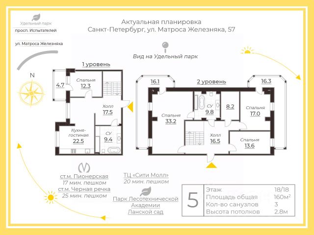 Арт. 123598010 Продается просторная, двухуровневая пятикомнатная квартира в Приморском районе Санкт-Петербурга на улице Матроса Железняка. Общая площадь квартиры составляет 160 м2, . Квартира расположена на последнем этаже 18-ти этажного дома. Жилая площадь составляет 118 м2! Окна квартиры выходят в зеленый двор и на улицу с прекраснейшим видом на Удельный парк. Квартира требует ремонта, что дает отличную возможность воплотить все ваши дизайнерские идеи и создать интерьер по своему вкусу. Планировка позволяет удобно организовать пространство для большой семьи или использовать его для различных нужд. В квартире есть отдельные раздельные санузелы и большая кладовая- гардеробная. Тихий, зеленый двор. Чистый, ухоженный подъезд. Хорошие соседи. В продаже отдельно продается машиноместо в подземном паркинге. В шаговой доступности находятся школы, детские сады, клиники и множество торговых центров. До станции метро "Пионерская " всего 10 минут пешком. Записывайтесь на просмотр! 5-комнатная квартира на улице Матроса Железняка в Санкт-Петербурге.