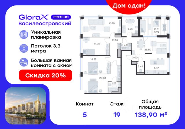 Продается 5-комн. квартира на 19-м этаже в сданном проекте премиум-класса GloraX Premium Василеостровский. Общая площадь лота составляет 140,22 кв. м, из которых 99,51 кв. м отведено под жилую и 6,47 кв. м под кухонную зону. Номер квартиры - 992 Преимущества квартиры: Просторная кухня; Два санузла; Большая ванная комната; Потолок 3,3 метра. GloraX Premium Василеостровский это роскошный видовой комплекс премиум-класса на первой береговой линии Финского залива. Проект уникален по своему опциональному наполнению: вся необходимая для комфортной городской жизни инфраструктура будет в составе самого комплекса. Здесь откроется фитнес-клуб класса премиум, кинотеатр только для резидентов, летом будет работать общая видовая терраса на крыше, откуда откроются потрясающие виды на воду. В GloraX Premium Василеостровский расположится гастрономический кластер - ресторанная улица с видом на Финский залив. В пяти минутах пешком от проекта GloraX строит образовательный кластер. В состав кластера войдет общеобразовательная школа с развивающими пространствами, футбольным полем, большим спортивным стадионом и 2 -мя плавательными бассейнами. Во втором корпусе проекта откроется детский сад с собственной территорией для прогулок. Транспортную доступность обеспечивает близость к ЗСД. Дорога до Дворцовой площади займет 25 минут на автомобиле. Ближайшая остановка общественного транспорта находится в 1 минуте пешком от комплекса. Все квартиры передаются с отделкой White Box. Цена указана при 100% оплате или стандартной ипотеке. Узнайте подробности в Отделе продаж.