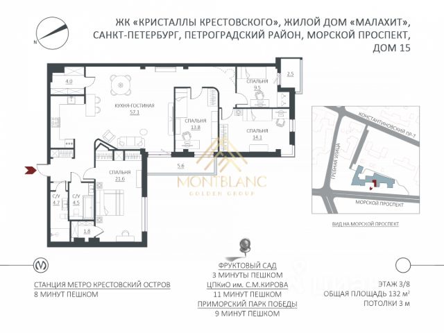 Арт. 124805783 Простор, свет и тишина. Квартира в одной из самых престижных и экологически чистых районах локаций Петербурга отражение безупречного вкуса и стремления к лучшему. Квартира полностью готова к проживанию, однако, имеет свободную планировку и может быть перестроена под ваш дизайн. Квартира находится на 3 этаже. Площадь 131.1 м2.. Высокие потолки, шумоизоляция, система центрального кондиционирования, панорамные окна создают эффектную и комфортную атмосферу. В Квартире 4 уютных спальни, функциональная кухня, большая гостиная, две лоджии, два санузла, две кладовых, одна из которых оборудована под прачечную. Архитектура ЖК "Кристаллы Крестовского" отличается оригинальным дизайном: фасады облицованы керамогранитом и натуральным камнем, а декоративные элементы из дерева и металла придают зданиям стильный и выразительный облик. Эффектное остекление окон и лоджий наполняет квартиру светом и открывает прекрасные вид. Транспортная доступность комплекса отличная: до ЗСД 10 минут езды, при этом остров остаётся уютным и тихим благодаря ограниченному количеству машин. До станции метро "Крестовский остров" всего 600 метров. В 10 минутах ходьбы расположен большой Приморский парк Победы и Центральный парк Культуры и отдыха (ЦПКиО). Один собственник. Все документы готовы к сделке. Звоните, чтобы узнать детали и договориться о просмотре!
