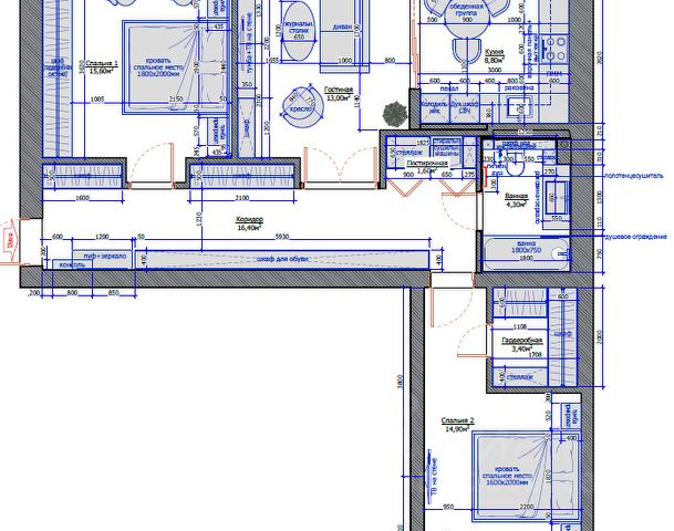 Новая мебель в комнатах: кровать 180х200 с подъемным механизмом и местом хранения, прикроватные тумбочки, диван раскладной, кресла, тумба под телевизор.