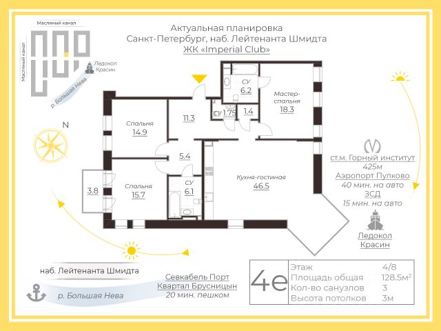 В шаговой доступности от жилого комплекса расположены станции метро (расстояние по прямой): "Горный институт" (1.0 км), "Василеостровская" (1.4 км), "Приморская" (1.5 км), также недалеко от этого корпуса расположены станции метро: "Спортивная", "Чкаловская".