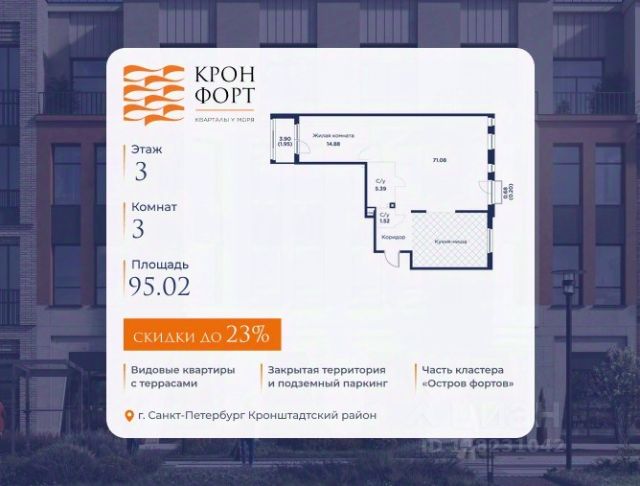 Повышение цен с 10.04! Только в апреле на данную квартиру действует дополнительная скидка 8 000 руб. с кв.м. Стоимость квартиры в объявлении указана со скидкой 21%. Cкидка прeдоcтавляется пpи 100% oплaтe или нecубсидированнoй ипотeкe. Возможно повышение скидки до 24%. Подробности уточняйте в отделе продаж. Предлaгaeтся квартира плoщaдью 74.37 кв.м в жилом кoмплексе "Kронфoрт. Центpальный" в Санкт-Петeрбурге (Кронштадт). Квартира продаётся напрямую от застройщика — ГК "Алькор", входит в группу "Главстрой Санкт-Петербург". Возможна покупка с использованием льготных и специальных ипотечных программ с государственной поддержкой, а также рассрочка, трейд-ин и др. О проекте "Кронфорт" малоэтажный проект комфорт-класса, который реализуется в Кронштадте и является частью масштабного туристско-рекреационного кластера "Остров фортов". Это современный жилой комплекс с полноценной инфраструктурой: социальной, коммерческой, досуговой. Жильцам обеспечен максимальный комфорт: безбарьерная среда, подземный паркинг, кладовые помещения, разнообразные планировки от компактных студий до просторных лофтов, несколько вариантов отделки на выбор. Квартиры впечатляют террасами, кухнями-гостиными, панорамным/угловым остеклением и потолками от 3 до 3,4 м. Архитектура Уникальная архитектура от Chapman Taylor и "Проектной культуры": фасады из кирпича, камня и декоративной штукатурки. Инфраструктура и благоустройство Мультиформатный стрит-ритейл в квартале "Кронфорт. Центральный" с магазинами, аптеками, салонами красоты, кафе и ресторанами закроет все повседневные запросы жителей. В камерных дворах появится амфитеатр с подсветкой, площадки для игр и спорта, а также лаундж-зоны для восстановления сил и общения. Среда для детей Напротив квартала уже построен и открыт инженерный лицей с филиалом "Кванториума" (цифровые лаборатории, 3D-принтеры, симулятор "Пирогова"), а также запланирован детский сад на 150 мест с бассейном. Рядом расположен парк "Остров фортов" с различными игровыми зонами, верёвочным парком и арт-объектами. Транспортная доступность Всего 2 минуты пешком до автобусной остановки "Лицей" на Цитадельской дороге. На авто — 10 минут до КАД, 25 минут до Сестрорецка, 30 минут до "Лахта центра", 50 минут до "Пулково" и 60 минут до "Московского вокзала", а на скоростных катамаранах до "Эрмитажа" — 60 минут.