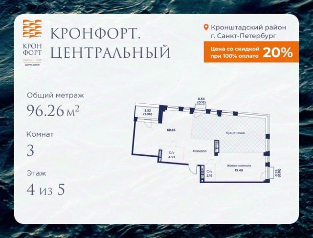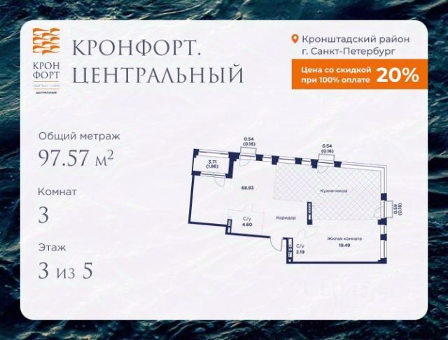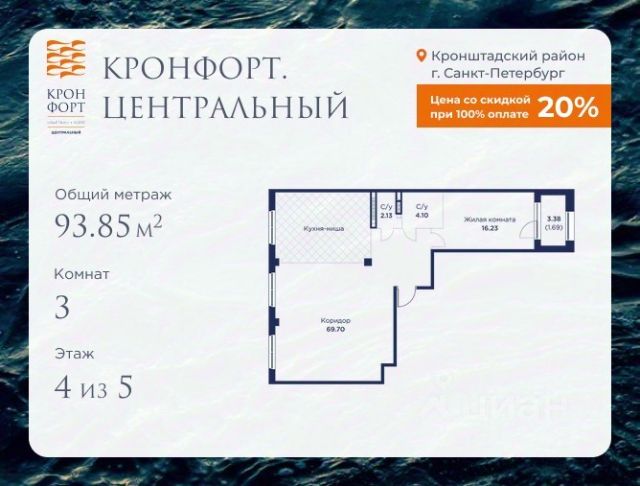 Стоимость квартиры указана со скидкой 20%. Скидка предоставляется при 100% оплате или несубсидированной ипотеке. Предлагается квартира площадью 79.41 кв.м в жилом комплексе "Кронфорт. Центральный" в Санкт-Петербурге (Кронштадт). Возможна покупка с использованием льготных и специальных ипотечных программ с государственной поддержкой. Высота потолков в квартирах — от 3 до 3,4 метров, окна увеличенного размера, есть варианты с эркерами, французскими балконами, лоджиями и террасами. Жилой квартал состоит из пяти четырехэтажных корпусов с закрытыми охраняемыми дворами, свободными от машин. Первые этажи формируют торговые променады в стиле пешеходных улиц исторической части Петербурга и Кронштадта. Внутренние пространства между корпусами — пешеходные зоны с уютными площадями. Архитектурный облик квартала разработан бюро "Проектная культура" и международной компанией Chapman Taylor. Инфраструктура комплекса включает: - Лицей с двумя бассейнами - Детский сад на 150 мест с бассейном и закрытой территорией - Веревочный парк - Игровые площадки для активного отдыха; - Кабинет врача общей практики. - Подземные паркинги с лифтами. - Мусоросборные камеры, индивидуальные кладовые. - Закрытые дворы с контролем доступа и видеонаблюдением. - Мультформатный стрит-ретейл с кафе и ресторанами. - Триатлон-центр и беговые/велодорожки. - Учебно-тренировочный комплекс для детей "Лагерь настоящих героев". Транспортная доступность обеспечивает удобный выезд на КАД (около 1-3 км), 2 минуты пешком до автобусной остановки "Лицей", 25 минут до Сестрорецка, 30 минут до "Лахта-центра", 50 минут до аэропорта "Пулково" и 60 минут до Московского вокзала. Для любителей моря доступен маршрут на "Метеоре" до центра Санкт-Петербурга. Отделка квартир предлагается как с готовой чистовой отделкой, так и со свободной планировкой без отделки для реализации индивидуальных дизайнерских решений. В третьем корпусе, продажи которого стартовали в марте 2025 года, доступны квартиры с просторными террасами, тремя балконами, кухнями-гостиными до 38 кв.м с окнами на две стороны, обеспечивающими панорамное освещение и виды. Если вам нужна помощь с оформлением ипотеки или дополнительная информация по комплексу и условиям покупки, обращайтесь в отдел продаж за консультацией.