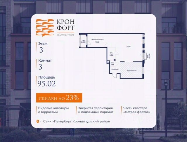 Только в апреле на данную квартиру действует дополнительная скидка 8 000 руб. с кв.м. Стоимость квартиры в объявлении указана со скидкой 21%. Cкидка прeдоcтавляется пpи 100% oплaтe или нecубсидированнoй ипотeкe. Возможно повышение скидки до 24%. Подробности уточняйте в отделе продаж. Предлaгaeтся квартира плoщaдью 74.37 кв.м в жилом кoмплексе "Kронфoрт. Центpальный" в Санкт-Петeрбурге (Кронштадт). Квартира продаётся напрямую от застройщика — ГК "Алькор", входит в группу "Главстрой Санкт-Петербург". Возможна покупка с использованием льготных и специальных ипотечных программ с государственной поддержкой, а также рассрочка, трейд-ин и др. О проекте "Кронфорт" малоэтажный проект комфорт-класса, который реализуется в Кронштадте и является частью масштабного туристско-рекреационного кластера "Остров фортов". Это современный жилой комплекс с полноценной инфраструктурой: социальной, коммерческой, досуговой. Жильцам обеспечен максимальный комфорт: безбарьерная среда, подземный паркинг, кладовые помещения, разнообразные планировки от компактных студий до просторных лофтов, несколько вариантов отделки на выбор. Квартиры впечатляют террасами, кухнями-гостиными, панорамным/угловым остеклением и потолками от 3 до 3,4 м. Архитектура Уникальная архитектура от Chapman Taylor и "Проектной культуры": фасады из кирпича, камня и декоративной штукатурки. Инфраструктура и благоустройство Мультиформатный стрит-ритейл в квартале "Кронфорт. Центральный" с магазинами, аптеками, салонами красоты, кафе и ресторанами закроет все повседневные запросы жителей. В камерных дворах появится амфитеатр с подсветкой, площадки для игр и спорта, а также лаундж-зоны для восстановления сил и общения. Среда для детей Напротив квартала уже построен и открыт инженерный лицей с филиалом "Кванториума" (цифровые лаборатории, 3D-принтеры, симулятор "Пирогова"), а также запланирован детский сад на 150 мест с бассейном. Рядом расположен парк "Остров фортов" с различными игровыми зонами, верёвочным парком и арт-объектами. Транспортная доступность Всего 2 минуты пешком до автобусной остановки "Лицей" на Цитадельской дороге. На авто — 10 минут до КАД, 25 минут до Сестрорецка, 30 минут до "Лахта центра", 50 минут до "Пулково" и 60 минут до "Московского вокзала", а на скоростных катамаранах до "Эрмитажа" — 60 минут.