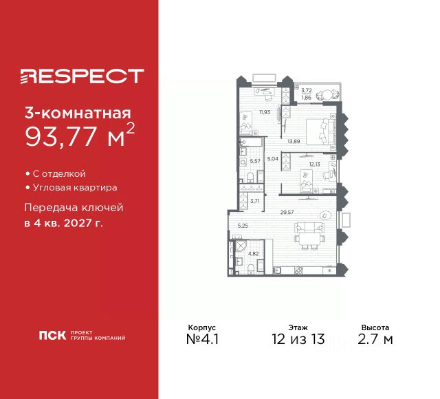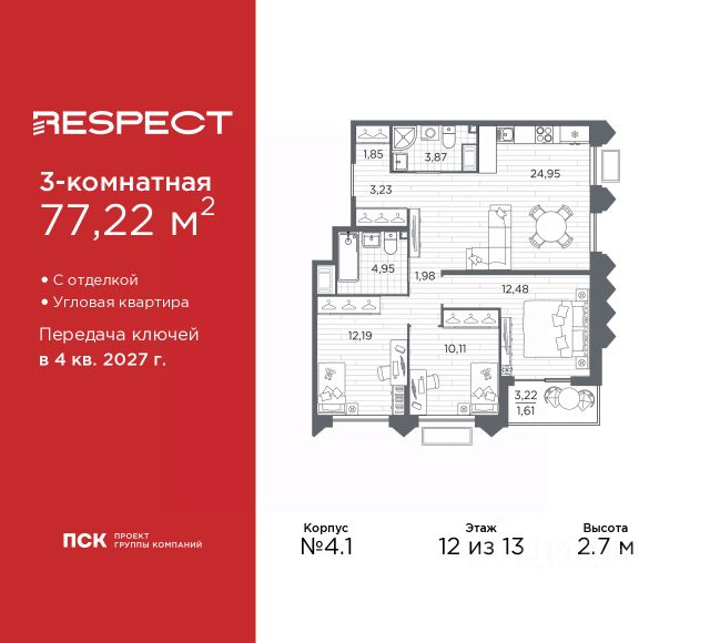 Просторная трехкомнатная квартира с предчистовой отделкой в ЖК "RESPECT" на 5 этаже. Общая площадь: 76.55 кв.м., жилая: 34.01 кв.м., площадь просторной кухни-столовой: 18.59 кв.м. Комнаты изолированные, все окна выходят на одну сторону. В квартире одна лоджия, два совмещенных санузла. Высота потолков 2.7 м. Квартира находится в корпусе 1. Дом монолитный, одноподъездный, высотой 13 этажей. На этаже 6 квартир. В подъезде 1 пассажирский и 1 грузовой лифт. Окончание строительства - 1 квартал 2026 года. Оформление сделки по договору долевого участия. В шаговой доступности от жилого комплекса находятся станции метро (расстояние по прямой): "Лесная" (800 м), "Площадь Мужества" (1.4 км), "Выборгская" (1.9 км), также недалеко от этого корпуса находятся станции метро: "Академическая", "Политехническая". Квартал строится на Полюстровском пр, 87, в одной из самых востребованных локаций Петербурга. В 10 минутах пешком - метро "Лесная" и в 10 минутах на транспорте - Петроградская сторона. Высота домов от 7 до 13 этажей. На территории Respect строится школа на 1125 учащихся и детский сад на 240 мест. Запроектированы собственная газовая котельная, закрытая территория, дворы без машин и подземные паркинги с лифтами. Вентилируемые фасады облицованы клинкерным кирпичом. Дома из этого материала служат веками, являясь гордостью хозяев. Дизайн парадных зон и входных групп - сочетание лаконичности отделки и декоративных элементов с текстурами из натурального камня и дерева с приглушенной подсветкой теплым светом. Во входных группах расположены гостевые зоны с мягкой мебелью. Вся территория квартала будет связана единой концепцией благоустройства, разработанной ландшафтным бюро L.BURO. В основе - идея создания увлекательного ландшафтного пространства для насыщенной жизни, включающего в себя пейзажные зоны, современные архитектурные композиции, открытые террасы на стилобатах с зонами отдыха и парклетами, спортивными площадками. Это пространство для людей всех возрастов и различных увлечений. На эксплуатируемой кровле на уровне первого этажа в домах 1 и 4 будут обустроены общественные видовые террасы. В квартале запроектированы внутренние закрытые территории дворов домов без доступа автомобилей и безбарьерная среда для велосипедистов и колясок. Предусмотрены IP-домофония с функцией дистанционного открывания калиток и парадных, а также дистанционный сбор показаний счетчиков и мобильное приложение для жителей. Для безопасности жителей квартала - круглосуточное видеонаблюдение и служба охраны. В каждой квартире предусмотрены внешние корзины для кондиционеров. #Z6bsuu