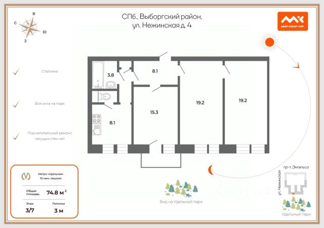 - 3 крупных городских парка на расстоянии 3-10 минут от дома: Удельный парк, Сосновка, парк Лесотехнической академии (прямо у дома! отличное место для утренних пробежек или прогулки с коляской).
