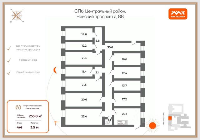 Арт. 133408627 Видовой пентхаус в ЖК "Новый город" с окнами в пол и высотой потолка 3,8 м. Много окон, много света, много воздуха. Вид на Неву, мост Петра Великого, парк, церковь и панораму города. Общеприведенная площадь с учетом площади двух теплых лоджий 206,5 кв.м. В квартире возможно организовать две зоны: гостевую зону с кухней, гостинной, кабинетом/гостевой спальней, гардеробной, гостевым санузелом, холлом и приватную зону с тремя спальнями, двумя санузелами и гардеробными. Есть две теплые лоджии 3,7 кв.м. и 6,8 кв.м. Квартира оборудована приточно-вытяжной вентиляцией. Квартира ориентирована на северо-восток. Квартира требует творческого дизайнерского подхода. Имеет огромный потенциал для реализации дизайнерских идей. ЖК"Новый город" - это жилой комплекс бизнес класса.Он находится рядом с историческим центром города, и в то же время удален от его суеты, шума и пробок на дорогах: до Невского проспекта около 2 км, до Смольного собора 1,5 км, до станции метро "Новочеркасская" 250 м, до КАД 15 минут, до аэропорта 25 минут. Территория комплекса огорожена, охраняется, без автомобильного движения, имеет свою инфраструктуру : несколько отделений банков, ресторан, детский клуб, детский бассейн, медицинские центры, салоны красоты, студия маникюра, спортивный зал, студия йоги, продуктовый магазин, аптека, прачечная, магазин одежды. Из комплекса есть выход в парк, с оборудованными детскими и спортивными площадками. Рядом набережная Невы с причалом. Под всем комплексом расположен 2-х уровневый подземный паркинг, в который можно спустится на лифте от дверей квартиры. Возможно приобрести два места за дополнительную сумму. Достойное предложение по адекватной цене. Это хорошая альтернатива Центральному району и ЖК в Красногвардейском районе. Приглашаю на просмотр. Лучше один раз увидеть, чем сто раз прочитать !