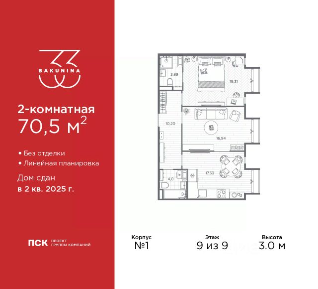 Двухкомнатная квартира от застройщика в ЖК "BAKUNINA 33" на 4 этаже. Квартира без отделки, после оформления собственности можно делать ремонт. Общая площадь: 72.5 кв.м., жилая: 35.11 кв.м., площадь просторной кухни-столовой: 15.36 кв.м. Квартира - распашонка, без проходных комнат, окна выходят на paзные стороны дома. В квартире одна лоджия, один совмещенный и один раздельный санузел. Высота потолков 3.0 м. Дом монолитный, трехподъездный, высотой 9 этажей. Квартира находится в 1-й секции в корпусе 1. На этаже 7 квартир. В подъезде 1 пассажирский и 1 грузовой лифт. Начало строительства - 2 квартал 2023 года. Строительство завершено, дом сдан во 2 квартале 2025 года. Оформление сделки по договору купли-продажи. В шаговой доступности от дома расположены станции метро (расстояние по прямой): "Площадь Александра Невского" (700 м), "Площадь Александра Невского 1" (700 м), "Площадь Александра Невского 2" (800 м), "Площадь Восстания" (1.4 км), "Новочеркасская" (1.5 км), также недалеко от этого корпуса расположены станции метро: "Владимирская", "Чернышевская", "Ладожская". Клубный дом BAKUNINA 33 - новый стандарт престижной жизни в Центральном районе. В 10 минутах от Невского проспекта и в двух минутах от Синопской набережной и Невы, в благоустроенной и знакомой среде. Локация клубного дома Bakunina 33 - идеальное место для погружения в культурную и светскую жизнь Санкт-Петербурга. В 10-15 минутах на машине почти все знаковые достопримечательности города: Эрмитаж, Русский музей, Александринский и Мариинский театры, БДТ, Таврический парк Казанский собор, Спас на крови и другие величественные дворцы, соборы, музеи, ради которых в город ежегодно съезжаются тысячи гостей. Каждая линия и каждый элемент дизайна дома является частью целостной концепции. Облик здания гармоничный, классически сдержанный с выверенными пропорциями и элегантными формами. Цветовые и архитектурные решения и эркеры придают облику дома легкость, доступную лишь респектабельной классике. Фасады привлекают внимание плавными ритмичными переходами. Вертикальная разбивка колоннами визуально устремляет здание ввысь. Плоскость фасадов декорирована разными элементами из гранита. Ограждение балконов, эркеры и колонны дополнены лаконичным геометрическим орнаментом в акцентном теплом сером цвете. Первые два этажа дома облицованы натуральным гранитом тёмного оттенка. Основной объём здания - выполнен штукатурным фасадом с окраской светлыми тонами из цветовой палитры " Традиционные цвета Санкт-Петербурга". Верхний этаж выполнен в стиле мансарды с высотой потолков в квартирах 3,5 метра. Этим достигается цель гармоничного и сомасштабного существования в одном фронте с существующими зданиями. За венчающим карнизом располагаются балконы девятого этажа. Ограждения балконов дополнены геометрическими узорами. Закрытый внутренний двор со сквером и детской площадкой. Острова зелени с водной чашей в центре создают ощущение гармонии и умиротворения. Современная уличная мебель и освещение фо