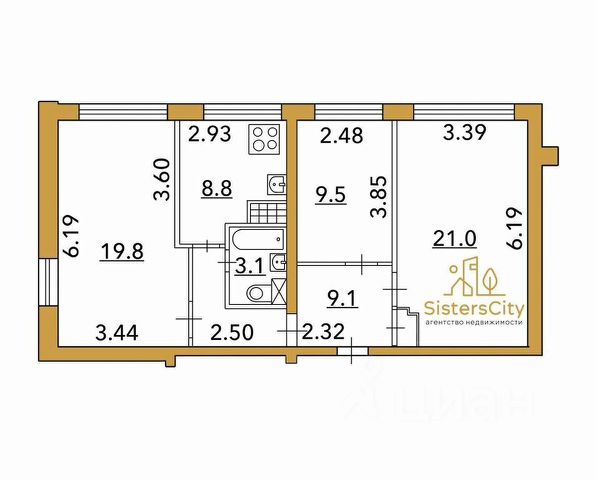 - жилая площадь 52,4 кв м: