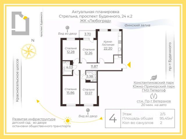 Район отличается хорошей траспортной доступностью, как на автомобиле так и на общественном транспорте. До ближайшей станции метро, "пр.Ветеранов"- 15 минут езды на автобусе-экспересс 343-Э, остановка общественного транспорта находится непосредственно у дома.