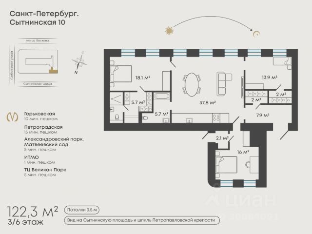 Арт. 130086653 Просторная квартира с новым дизайнерским ремонтом в лучшей части Петроградской стороны. Удобная планировка: кухня-гостиная и 3 большие спальни; Высокие потолки 3,5 метра; Огромные арочные окна; Вид на зелень, университет ИТМО и шпиль Петропавловской крепости; Южная сторона - естественный свет и ощущение простора; Тихая, не проездная улица Планировка идеальна для комфортной жизни: Огромная кухня-гостиная — сердце дома, идеально подходящая для семейных ужинов и тёплых встреч с друзьями; Мастер-спальня для полноценного комфорта; Отдельная детская или гостевая комната; Уютный кабинет для работы, творчества или третьей спальни; Целых 4 гардеробные — места для хранения хватит всем; 2 санузла: с душем и ванной. В квартире выполнен качественный ремонт: заменены все коммуникации, на полу дубовый паркет, мраморные подоконники, высокие двери, качественная сантехника и бытовая техника Bosch, кухня из натурального шпона, есть вся необходимая мебель. Заезжай и живи! Перепланировка узаконена, увеличена мощность электроэнергии 15 кВт, установлены и согласованы кондиционеры. Парадный вход, две квартиры на этаже, широкая парадная с лифтом, установлены камеры видеонаблюдения. Идеальная локация - Александровский парк, Матвеевский сад 3 минуты пешком, до Петропавловской крепости и набережных можно дойти за 15 минут. Магазины, школы, детские сады и вся инфраструктура в пешей доступности! Эта квартира — превосходный вариант для тех, кто ценит комфорт современных решений и историческую атмосферу Петербурга.