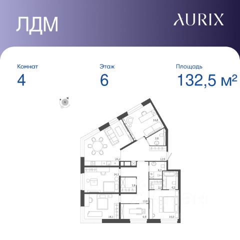 Продается 4-к квартира без отделки в ЖК "ЛДМ". Общая площадь квартиры — 132.5 кв. м, этаж 6 из 9. Тип дома — монолитный. Цена указана при 100% оплате. Описание из материнского фида