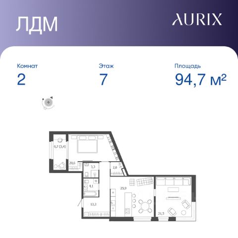 Продается 2-к квартира без отделки в ЖК "ЛДМ". Общая площадь квартиры — 94.7 кв. м, этаж 7 из 9. Тип дома — монолитный. Цена указана при 100% оплате. Описание из материнского фида