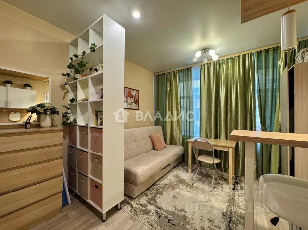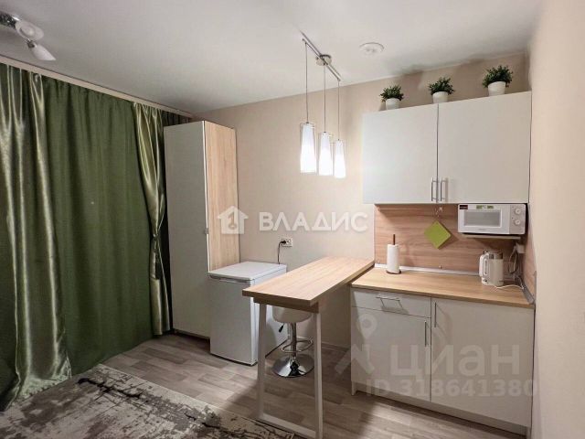 - в 1 комнате-студии площадью 10.8 кв.м. находятся кровать-комод, стол и стулья, шкаф для хранения вещей и одежды, гардеробная с зеркалом, настенные полки и большой подоконник, кухонный гарнитур с раковиной, варочной панелью и холодильником, м/в печью, чайником и посудой, стиральная машина.