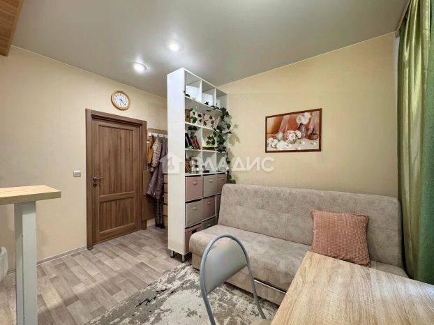 - в 4 комнате-студии площадью 11.1 кв.м. двуспальный диван, рабочее место (настенные полки, стеллаж, стол и стул), шкаф, комод и обувница для хранения вещей и одежды, гардеробная с зеркалом, кухонный гарнитур (аналогичное наполнение), стол и стулья, холодильник.