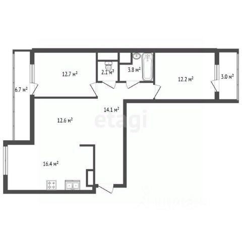 Площадь квартиры — 88,9 м², высота потолков — 2,75 метра. Двусторонняя планировка с изолированными комнатами включает гостиную и спальню с панорамными окнами, ещё одну спальню с увеличенными окнами, кухню, большую ванную комнату с сауной, совмещённый санузел и две просторные лоджии.