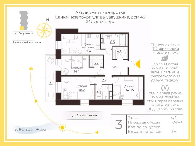 Школа 683 и школа Олимпийские надежды во дворе, в шаговой доступности два детских сада, торговые центры, кинотеатр, супермаркеты, 20 минут на авто до пляжей Курортного района, 40 -до аэропорта Пулково.