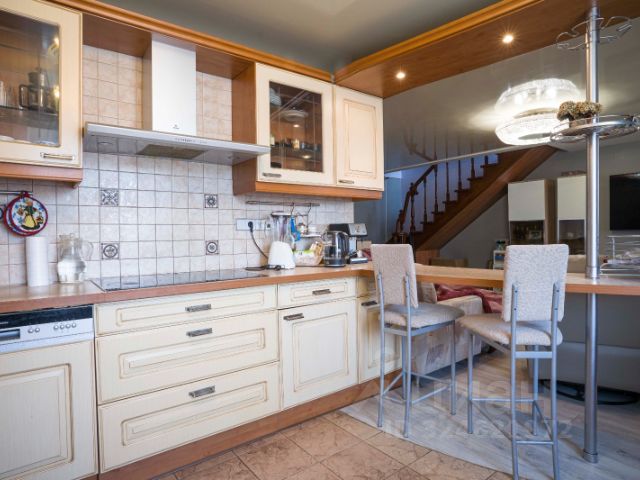 Кухонная мебель итальянского производства (венге с серым матовым алюминием). Встроенная импортная техника: два холодльника, керамическая электроплита с вытяжкой, духовой шкаф, посудомоечная машина, стриральная машина. Отдельно установлена морозильная камера, есть бар- холодильник для напитков.