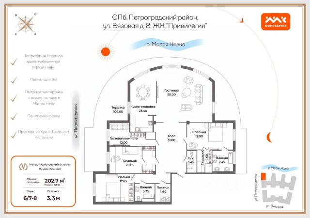 Трехкомнатная семейная квартира с ремонтом ПРЕМИУМ класса в ЖК Привилегия. ЖК Привилегия - это: Красивейший, престижный комплекс на берегу Малой Невки. Вкуснейшие завтраки в Лобби - баре. Премиальный консьерж сервис, служба портье и горничных СПА салон, Винный бутик, роскошная гостиная с роялем, ресторан, продуктовый маркет на территории дома и многое другое. Приватная территория Причал для яхт и 400-метровая набережная. Образ жизни и добрососедство. Наша квартира: Изолированная гостиная 25 м. Кухня-столовая 25 м Две МАСТЕР спальни. Три санузла. Две гардеробные. Качественная стильная отделка. Премиальные марки техники и мебели. Бытовая техника - Miele. ОСВЕЩЕНИЕ в квартире - отдельный предмет гордости. ТОП марки. Красиво и стильно. Климат-контроль в каждом помещении. Mitsubishi premium. Большая лоджия с панорамным остеклением. ВИД на Вязовую улицу и во двор на фонтан. Этаж 4 (по ПИБу этаж 6). Дополнительно - парковочное место в подземном паркинге с удобной системой хранения. Полностью готовая для жизни квартира в одном из лучших ЖК Петербурга для Вас! Звоните! Арт. 39939961