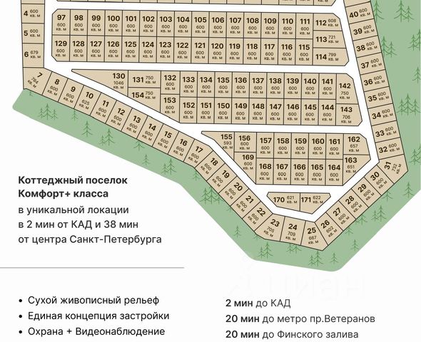 Коттеджный поселок комфорт+ класса в уникальной локации в 2 мин от КАД и 38 мин от центра Санкт-Петербурга Сухой живописный рельеф Единая концепция застройки Охрана + Видеонаблюдение Электричество 15 кВт Дорога с асфальтным покрытием Детская площадка + Спортзона Въездная группа с зоной отдыха Зимний водопровод (возможность подключения) 2 мин до КАД 20 мин до метро пр.Ветеранов 20 мин до Финского залива 38 мин до центра Санкт-Петербурга 10 мин до Петергофа (дворец и фонтаны)
