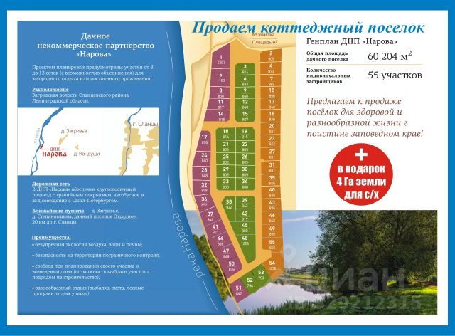 Арт. 134872554 Продаем готовый по документам коттеджный посёлок на берегу реки Нарва, в Сланцевском районе Ленинградской области. Массив полностью размежеван на 55 индивидуальных участков, площадью от 8 до 12 соток. Все документы готовы, вид разрешенного использования - для дачного строительства. Общая площадь дачной застройки - 6 Га. В подарок, на выбор, идет один из 2-х массивов, площадью 4 Га, с видом разрешенного использования - для с/х. Второй из них можно купить дополнительно. Кадастровые номера массивов для с/х: 47:28:0128001:82 47:28:0128001:72 Если нужно - поможем с переводом из с/х - в "дачку". Затраты на освоение размежеванного массива под коттеджный посёлок - минимальны. Вся территория - бывшие луговые земли. Если нужно - поможем по всем техническим вопросам, дадим все необходимые контакты. 180 км от КАД до деревни Загривье, также можно приехать общественным транспортом. В ней же продуктовый магазин, детский сад и школа, мед.центр и почта, храмы и администрация. А дальше - свой берег реки Нарва, леса, чистейший воздух, полная экология! Пропускная система въезда на пограничные территории - отсекает всех праздных людей. Прямая продажа. 1 собственник. В собственности более 5 лет. Выгодное инвестирование! Торг за быстрый выход на сделку. Все подробности - по телефону. ВНИМАНИЕ: возможен обмен всех трёх массивов - на квартиру в Санкт-Петербурге + доплата от 20 млн. руб. Купить участок для дачи в сельском поселении Загривское Сланцевского района.
