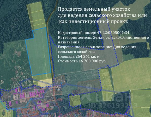 ID: 312131 Продается земельный участок для ведения сельского хозяйства или как инвестиционный проект. Кадастровый номер: 47:22:0605001:34 Категория земель: Земли сельскохозяйственного назначения Разрешенное использование: Для ведения сельского хозяйства. Преимущества участка - юридическая чистота: Участок прошел все необходимые процедуры оформления. Развитая инфраструктура: Удобное расположение, доступ к основным коммуникациям и отличное транспортное сообщение. Возможность использования: Идеально подходит для включения в границы населенных пунктов, ведения сельского хозяйства или дальнейшего перевода в земли промышленности. Доступность: Легкий доступ к дорогам общего пользования. ЖД станции "Кикерино" и "Волосово" в 9 км. Цена: 16 700 000 руб. Контактная информация: На вопросы подробно отвечу по телефону, либо на встрече в центральном офисе Адвекс по адресу: СПб, ул Фурштатская 43. ГПЗУ по запросу предоставлю. Звоните или пишите! Готова ответить на ваши вопросы.