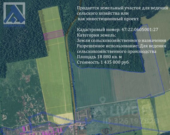 ID: 312132 Продается земельный участок для ведения сельского хозяйства или как инвестиционный проект. Кадастровый номер: 47:22:0605001:27 Категория земель: Земли сельскохозяйственного назначения Разрешенное использование: Для ведения сельскохозяйственного производства Преимущества участка - юридическая чистота: Участок прошел все необходимые процедуры оформления. Развитая инфраструктура: Удобное расположение, доступ к основным коммуникациям и отличное транспортное сообщение. Возможность использования: Идеально подходит для включения в границы населенных пунктов, ведения сельского хозяйства или дальнейшего перевода в земли промышленности. Доступность: Легкий доступ к дорогам общего пользования. ЖД станции "Кикерино" и "Волосово" в 9 км. Цена: 1 435 000 руб. Возможен торг. Контактная информация: На вопросы подробно отвечу по телефону, либо на встрече в центральном офисе Адвекс по адресу: СПб, ул Фурштатская 43. ГПЗУ по запросу предоставлю. Есть возможность выкупить соседние участки единым массивом. Инвестируйте вовремя, такое ценовое предложение встречается редко. Звоните или пишите! Готова ответить на ваши вопросы.