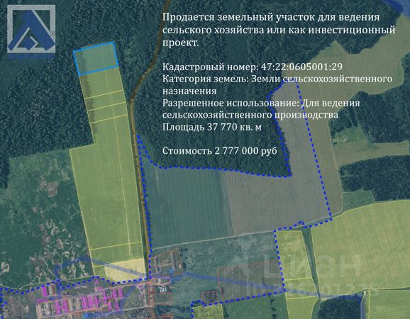 ID: 312133 Продается земельный участок для ведения сельского хозяйства или как инвестиционный проект. Кадастровый номер: 47:22:0605001:28 Категория земель: Земли сельскохозяйственного назначения Разрешенное использование: Для ведения сельскохозяйственного производства Преимущества участка - юридическая чистота: Участок прошел все необходимые процедуры оформления. Развитая инфраструктура: Удобное расположение, доступ к основным коммуникациям и отличное транспортное сообщение. Возможность использования: Идеально подходит для включения в границы населенных пунктов, ведения сельского хозяйства или дальнейшего перевода в земли промышленности. Доступность: Легкий доступ к дорогам общего пользования. ЖД станции "Кикерино" и "Волосово" в 9 км. Цена: 2 777 000 руб. Возможен торг. Контактная информация: На вопросы подробно отвечу по телефону, либо на встрече в центральном офисе Адвекс по адресу: СПб, ул Фурштатская 43. ГПЗУ по запросу предоставлю. Есть возможность выкупить участки единым массивом по привлекательной цене. Инвестируйте вовремя, такое ценовое предложение встречается редко. Звоните или пишите! Готова ответить на ваши вопросы.