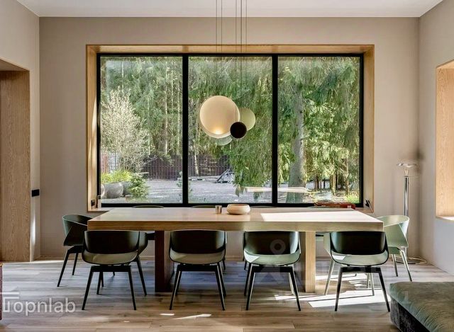 В доме используются энергоэффективные панорамные окна (профили SCHUCO, Германия), которые визуально стирают границу между интерьером и природой, но в то же время обеспечивают надежную тепло- и звукоизоляцию в любое время года.