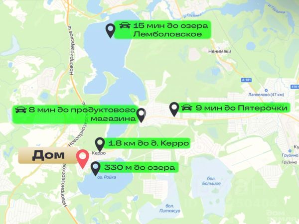 Поселок расположен в экологически чистом районе, давно обжит. Вокруг величественные сосны, тишина, соседи дружелюбные. Въезд через шлагбаум, территория поселка охраняемая. Дороги чистятся. Красивейшее озеро Ройка с собственным песчаным пляжем расположено в пешей доступности - 330 метров, 20 минут спокойным шагом. Озеро Ройка соединено с Лемболовским одноимённой речкой Ройка. Излюбленные места для рыбаков. Лемболовское озеро находится на расстоянии 12 км и 15 минут езды на автомобиле. Ежегодный платёж 13000 рублей.